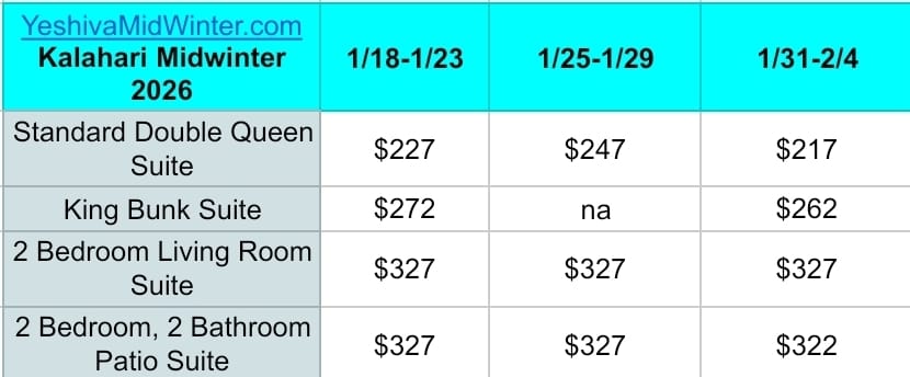 -Rooms should be booked online. Scroll down for booking instructions. If you have any issues booking online, call Kalahari reservations at 877-525-2427