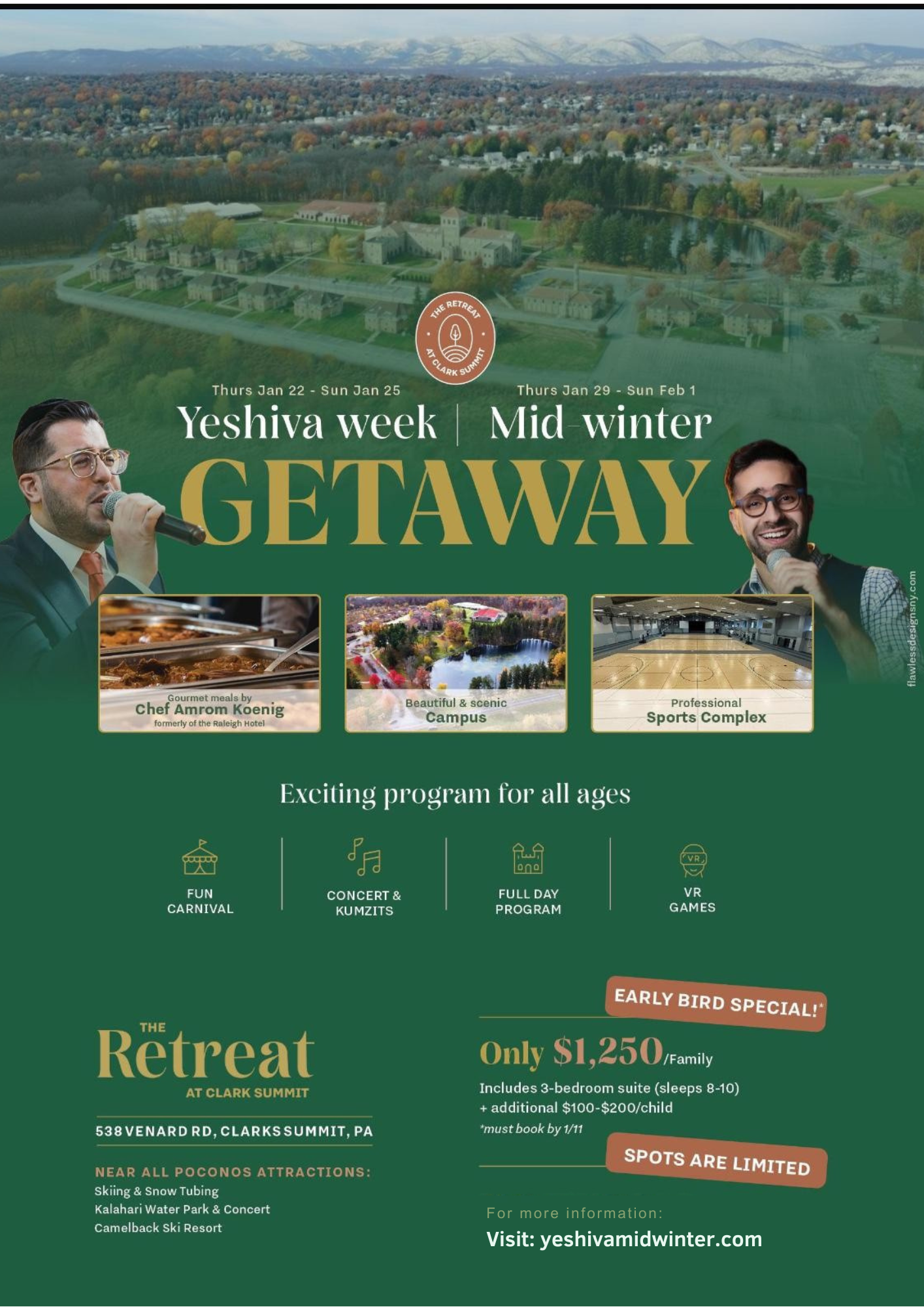 This is a great new option I’m happy to bring to everyone. After a smashing successful Shabbos-Chanukah, they are opening up this retreat weekend for Yeshiva Midwinter Break (1/24 and 1/31). This college campus has been turned into a Kosher Retreat destination. It is not a three or four star hotel, but it’s comparable to a nice bungalow. This will have a little more of a campy vibe than a full service fancy program (which would cost much more). However, at this price point, it’s a steal. The place is clean, neat, well maintained and very spacious. It’s a slam dunk to get 3 rooms for 3 nights, fully catered, and tons of programing and entertainment for the kids. I’ve heard good reviews on the vibes (very chilled and laid back), good feedback on the food (good taste and plenty of it), and the kids all had a blast. This is an exciting new option that I’m happy to share and be involved with.
